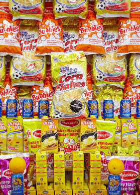 Cultural Village is a questioning of the complications of living in a capitalist world as well as being a shrine to some of my favorite South African food items. It muddles what is deemed worthy of such a position within a neoliberal world system. While most of these items are not healthy for the body nor are they examples of conscious consumption they hold a meaningful space in daily life and cultural memory. The colours and textures of the items emit an energy and glow. They speak to the kind of signage synonymous of a capitalist world but also of the rich colours and golden hues of a shrine.